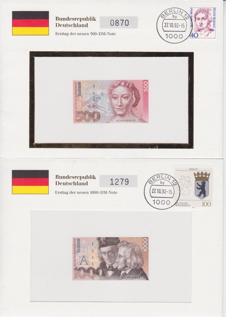 2 Banknotenbriefe: 500 + 1000 Mark (ohne Banknote)