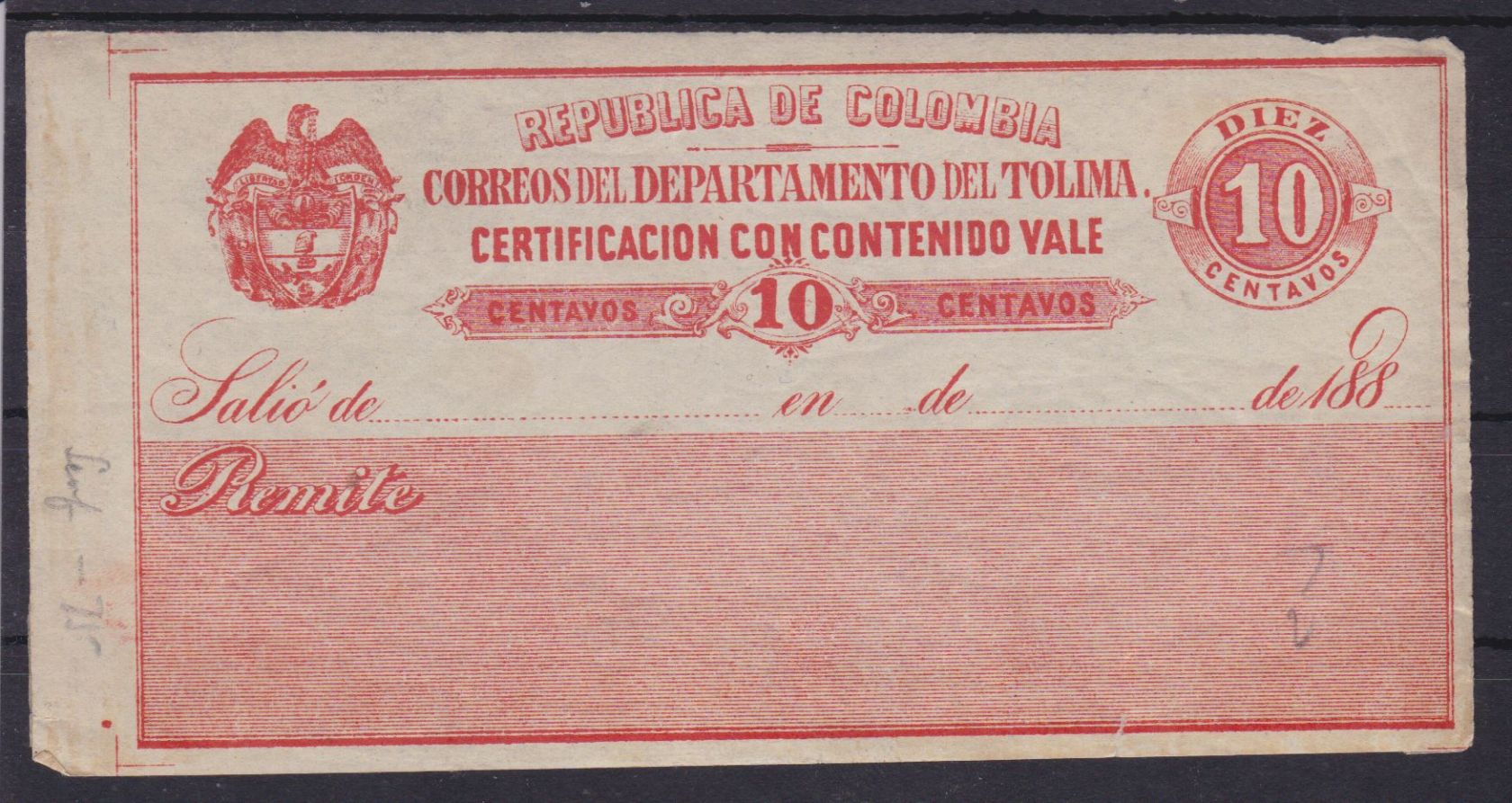 Kolumbien Tolima Wertbriefversicherungsmarke 10 I Certificacion con contenido