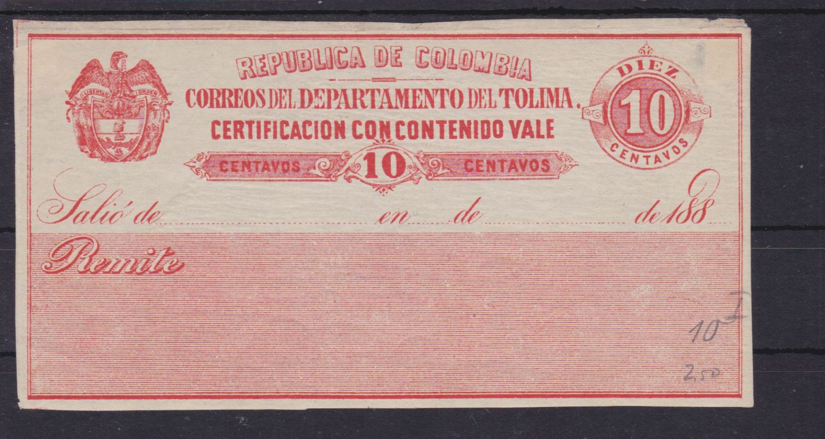 Kolumbien Tolima Wertbriefversicherungsmarke 10 I Certificacion con contenido