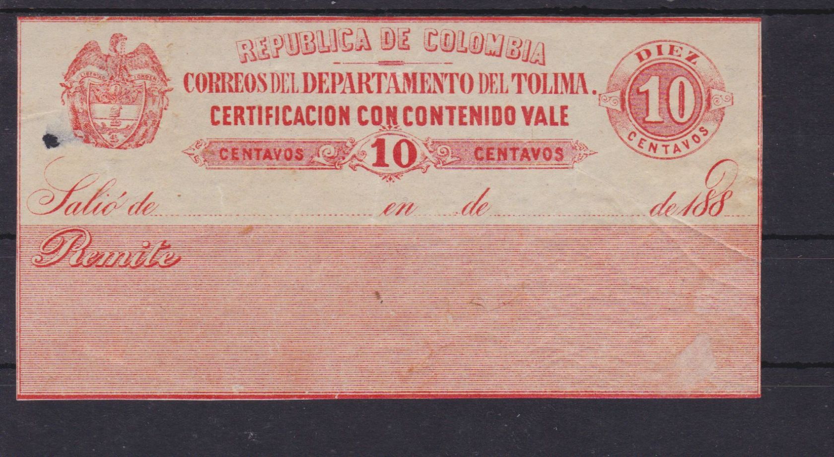 Kolumbien Tolima Wertbriefversicherungsmarke 10 I Certificacion con contenido