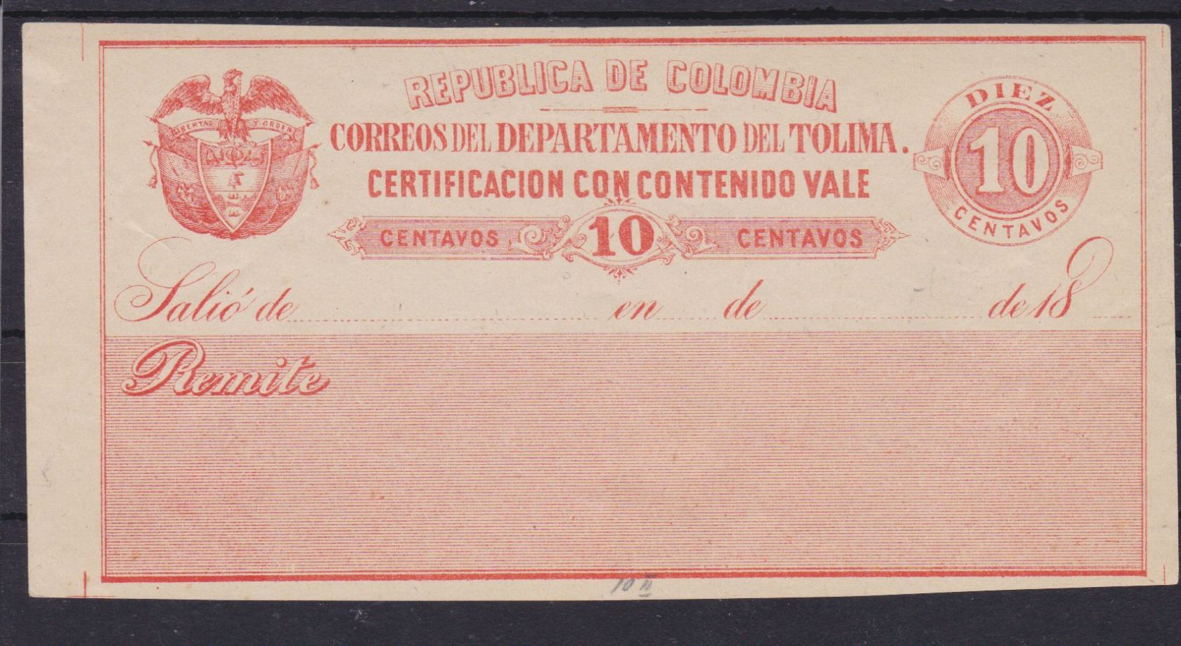 Kolumbien Tolima Wertbriefversicherungsmarke 10 II Certificacion con contenido