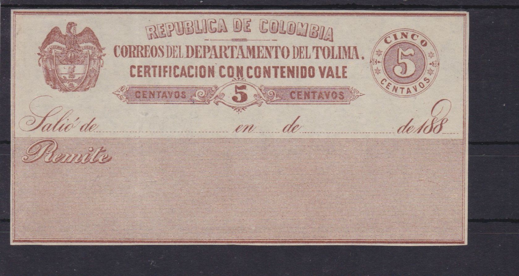 Kolumbien Tolima Wertbriefversicherungsmarke 9 I Certificacion con contenido