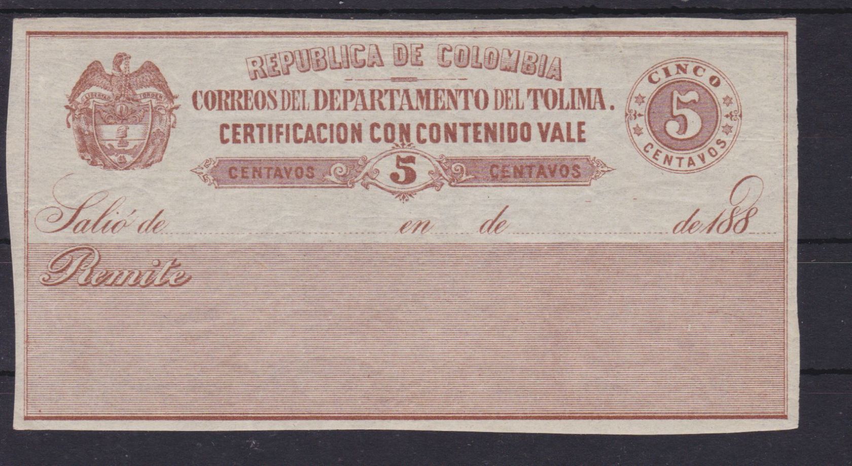 Kolumbien Tolima Wertbriefversicherungsmarke 9 I Certificacion con contenido